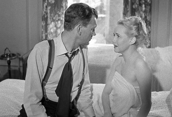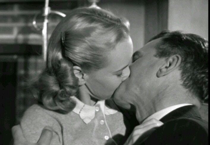 Maybe producer Bert E. Friedlob thought he’d alleviate any cringeworthy concerns by having Wright dye her hair blonde, but that makes it even worse. It’s like Charlie gets off the train at the end of Shadow of a Doubt, finds Uncle Charlie, discovers that he survived, maybe even suffered amnesia (film noir’s greatest malady, after all), got him some therapy, married him, moved to LA, and then died her hair just in case anyone suspected anything.