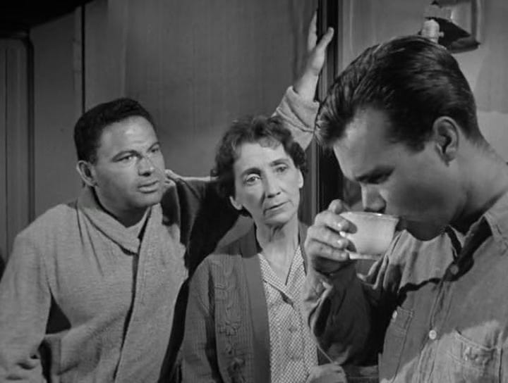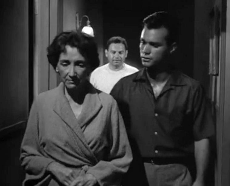 Recently I watched an episode of Alfred Hitchcock Presents called “Heart of Gold” from Season 3. Darryl Hickman plays Jackie, a young criminal just released from prison who promised his cellmate Allie (who’s still in lockup) he’d visit Allie’s family. Allie’s mom Martha (Mildred Dunnock) and her other son Ralph (Nehemiah Persoff) are skeptical of Jackie’s motives, but soon warm up to him. For a while…
